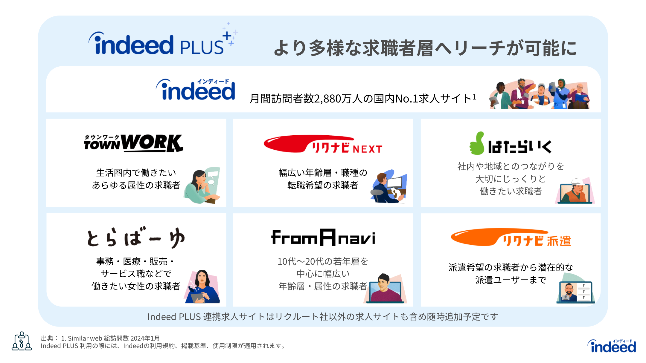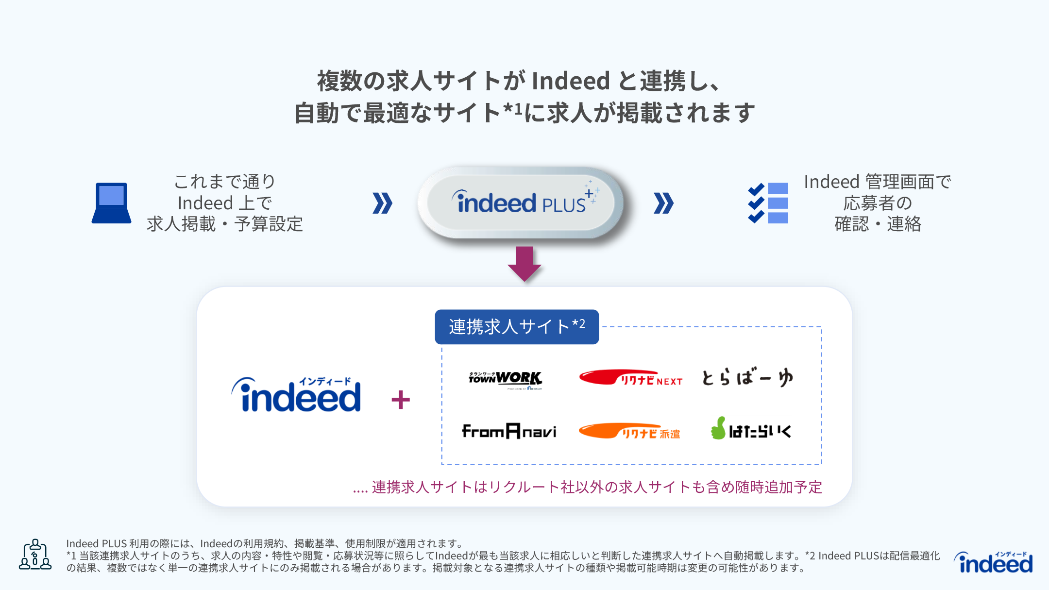 一度の求人投稿で、Indeed PLUSが連携する国内主要求人サイト利用者に求人票を届けることが可能に。